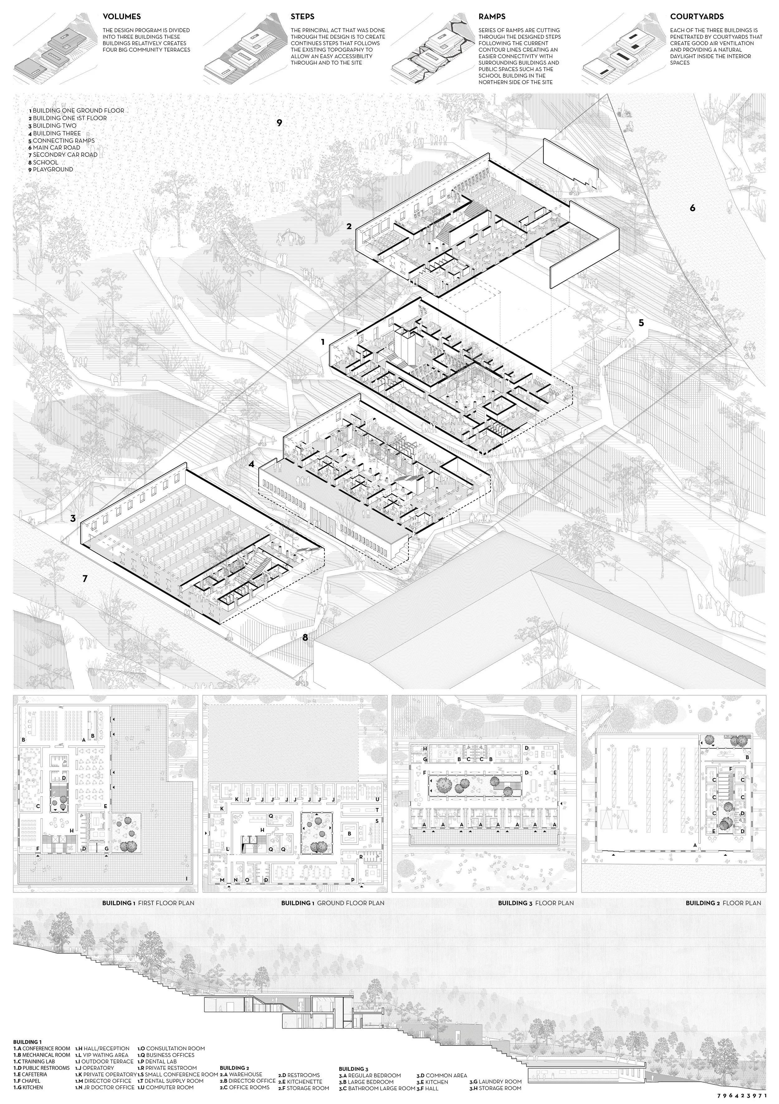 The design program is divided into three buildings these buildings relatively creates four big community terraces, each of these buildings is penetrated by courtyards that create good air ventilation and providing a natural daylight inside the interior spaces. The highest building in the design is building 1 which is a two floors building and it is located in the close side to the main car road, and this building contains most of the medical and educational spaces.