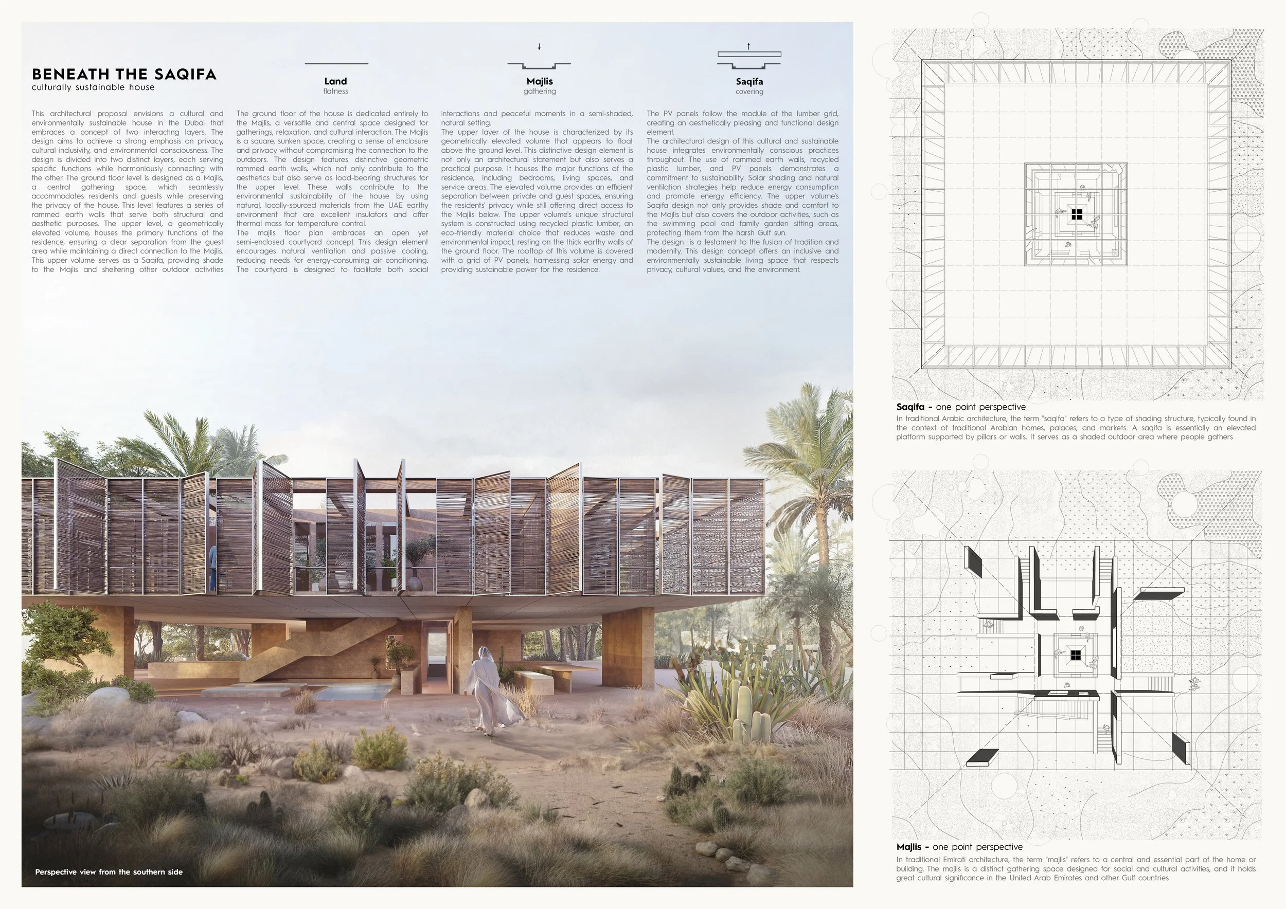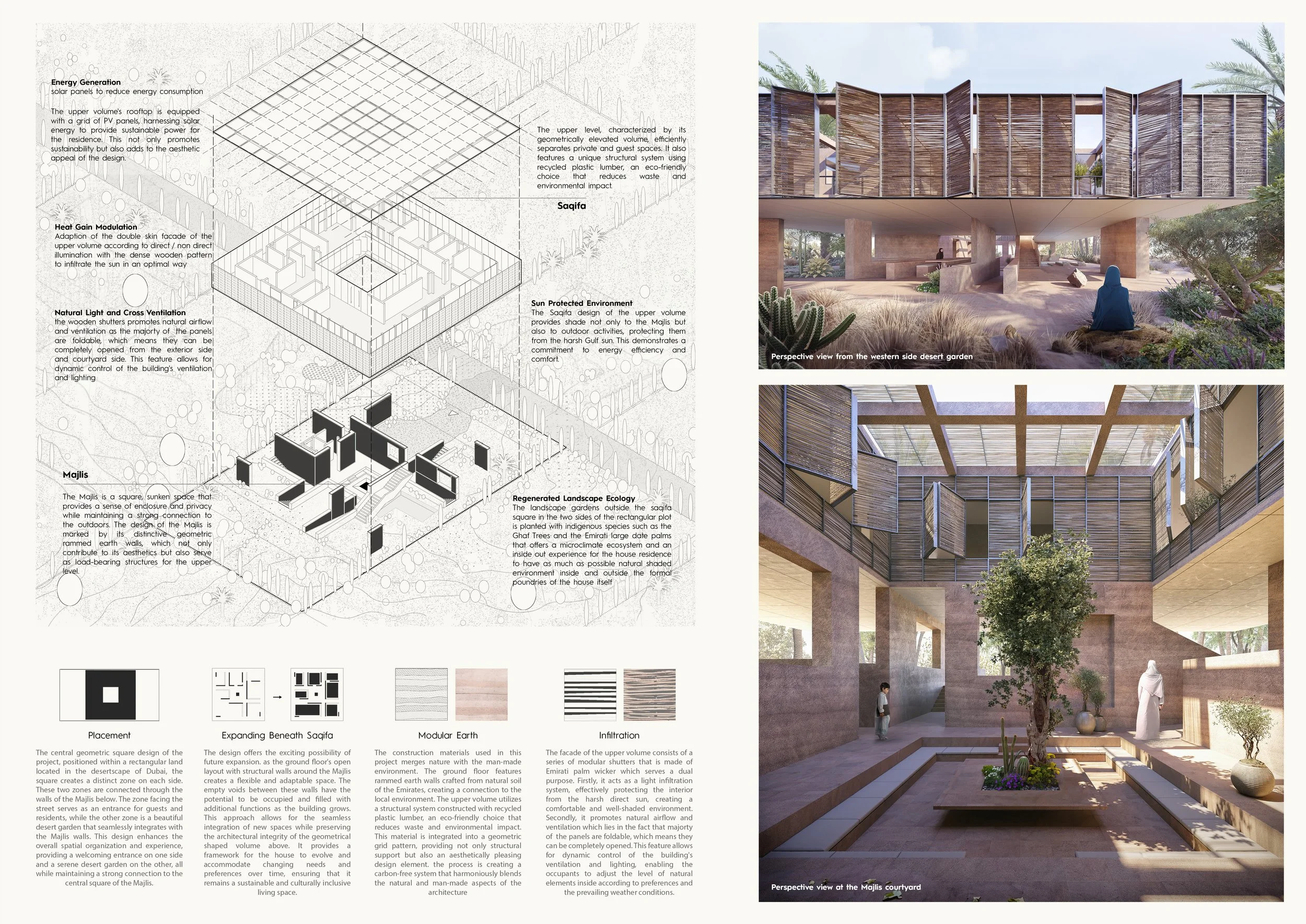 This architectural proposal envisions a cultural and environmentally sustainable house in the UAE that embraces a concept of two interacting layers. The design aims to achieve a strong emphasis on privacy, cultural inclusivity, and environmental consciousness. The design is divided into two distinct layers, each serving specific functions while harmoniously connecting with the other.