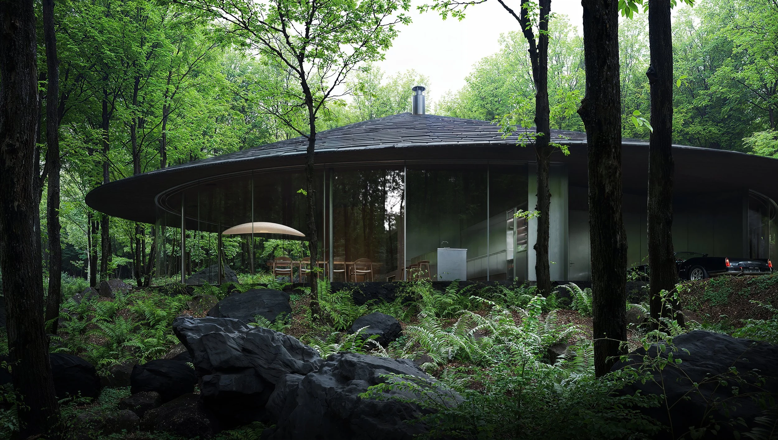 Nestled in the pristine landscape of Kitakaruizawa, Japan, the design harmonizes architecture with nature. Suspended between natural rock formations, the house features an elliptical roof that blends into the terrain. Glass facades frame forest views, while materials like warm wood and earthy textures echo the site’s essence.