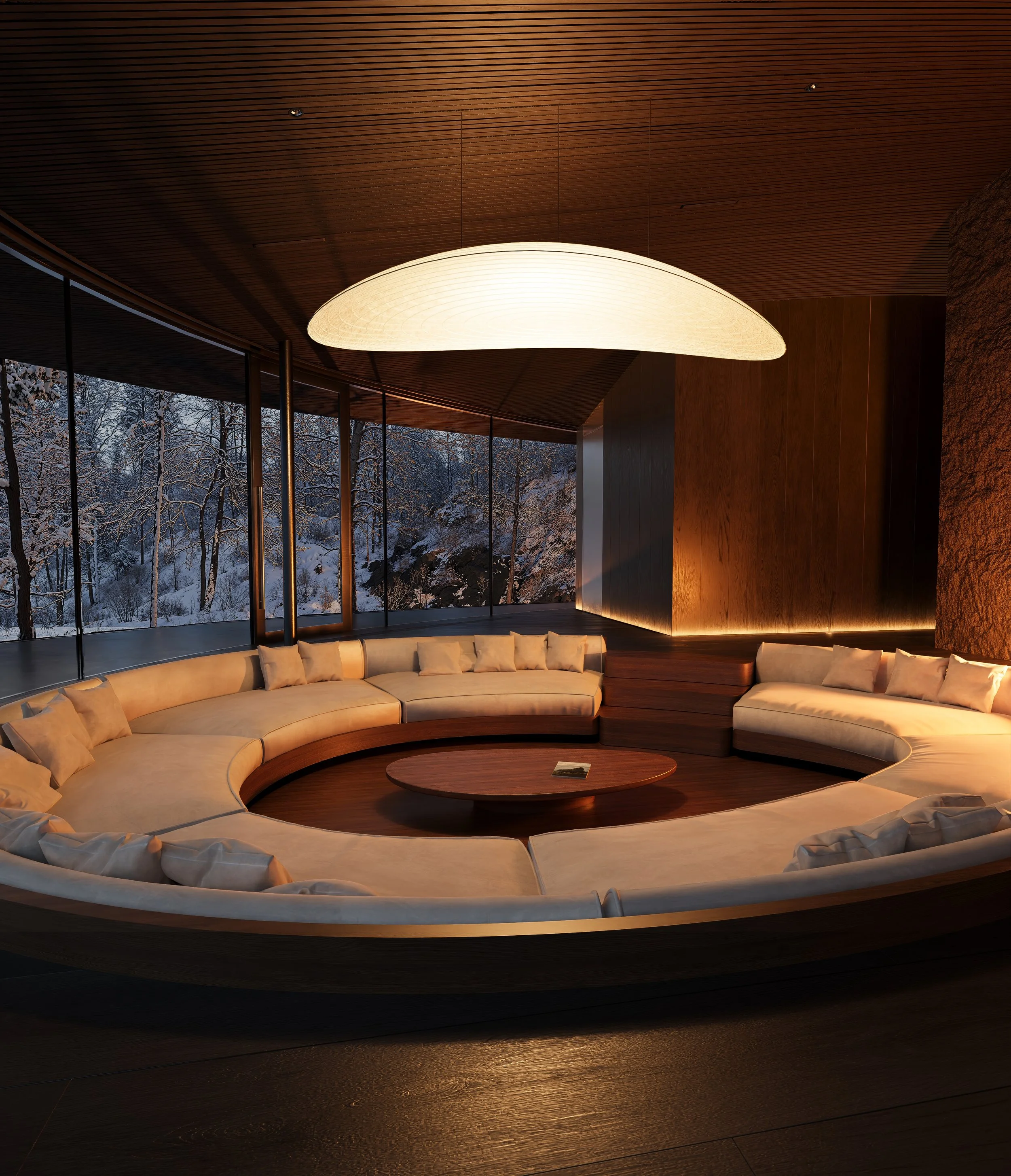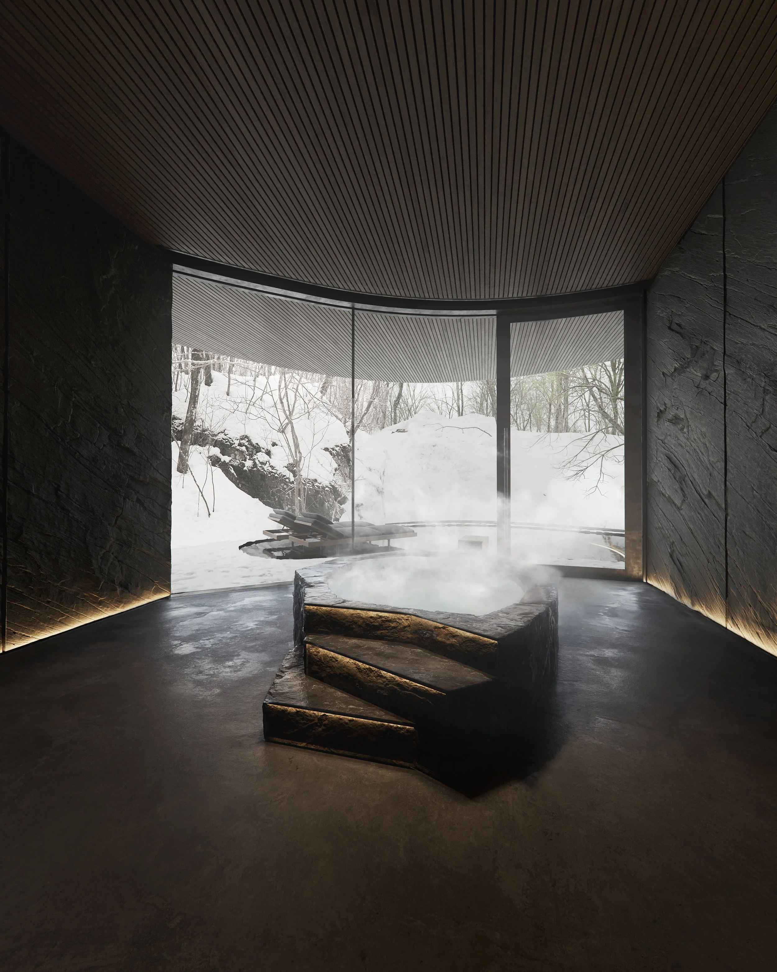 Materials are reduced, tactile, and elemental. Dark, warm wood wraps walls and ceilings, creating a cave-like atmosphere that contrasts gently with the openness of the glazing. Stone surfaces retain their raw texture, allowing imperfections to remain visible and honest. Metal elements appear with restraint, grounding the spaces with a subtle industrial precision.