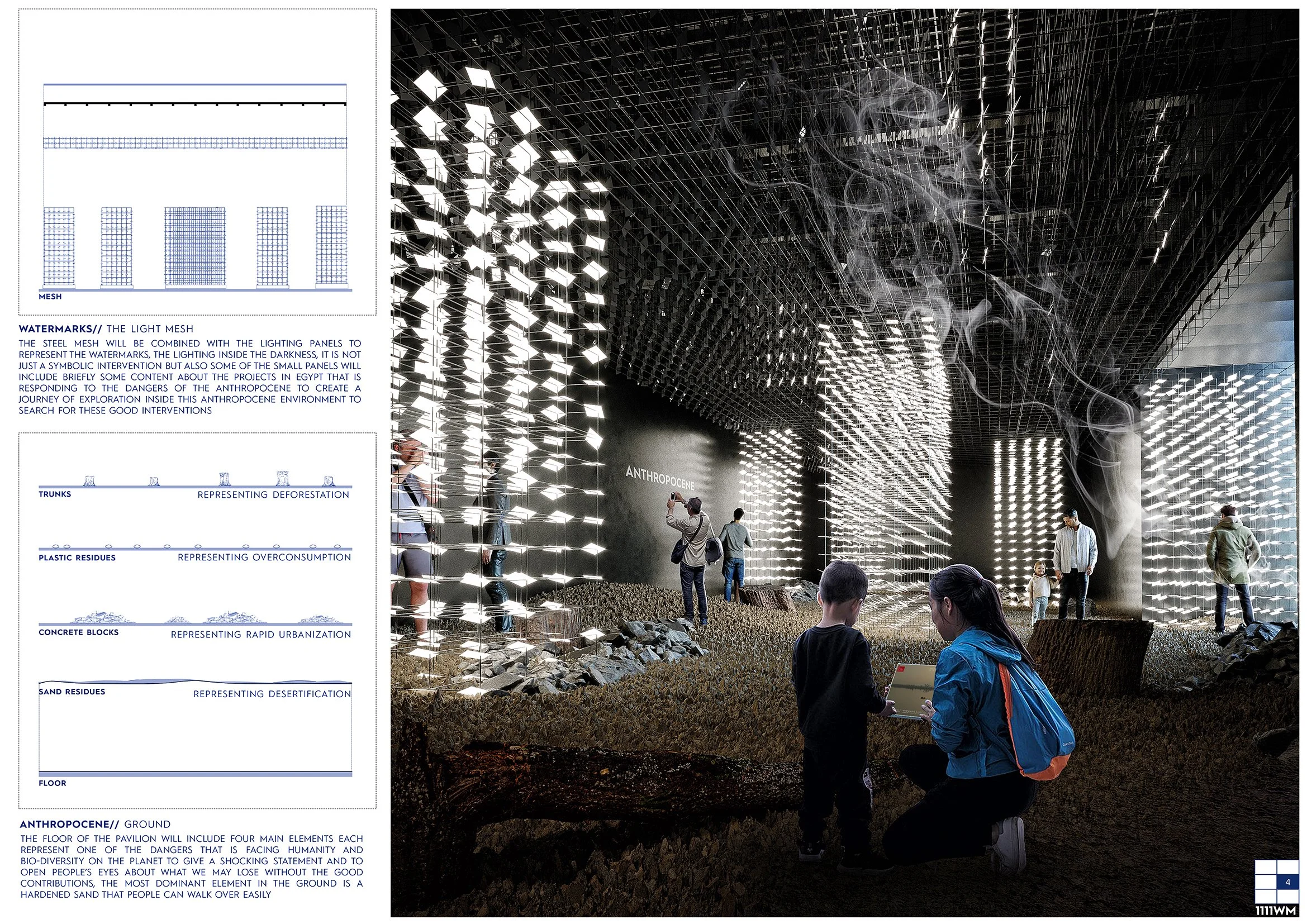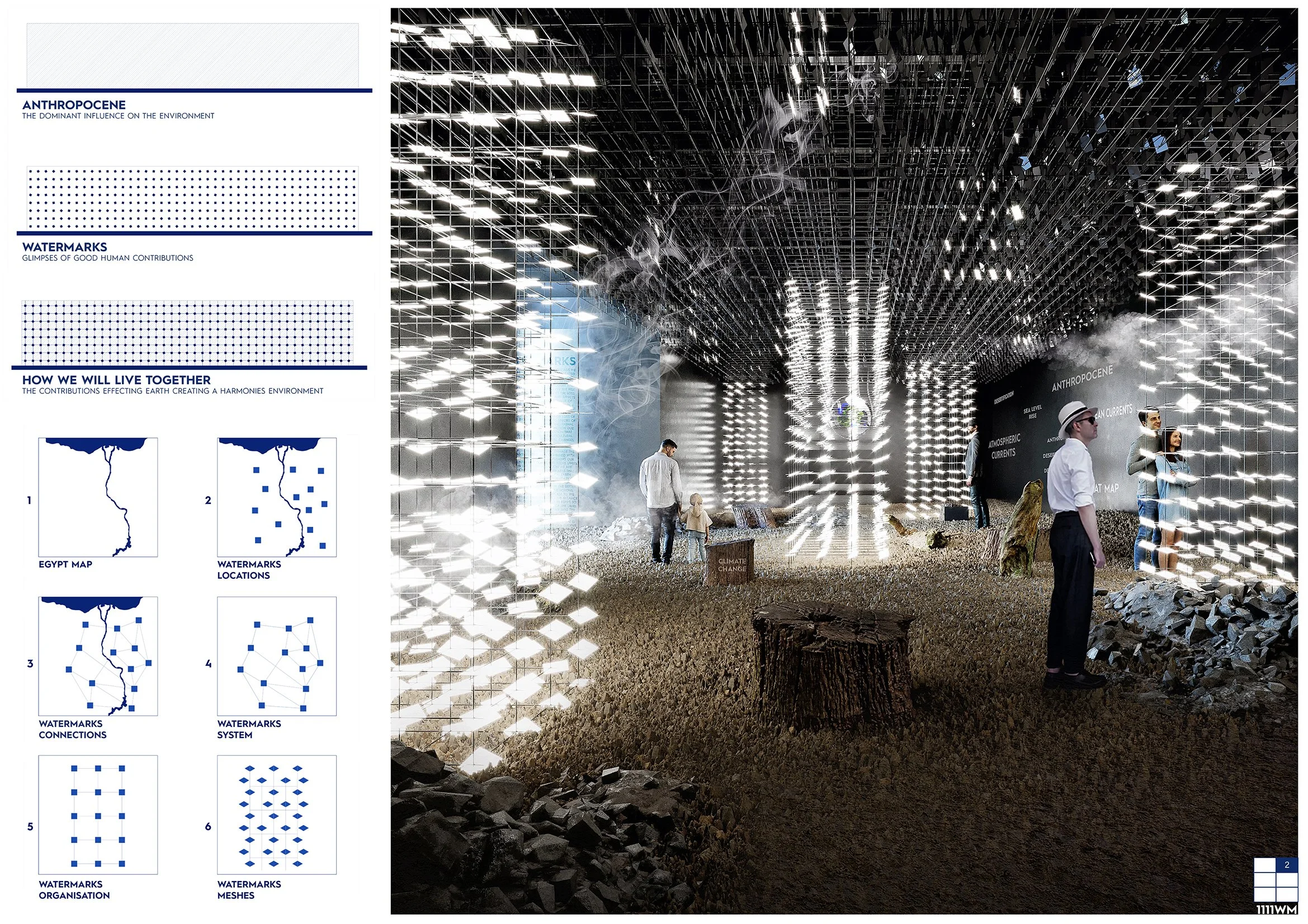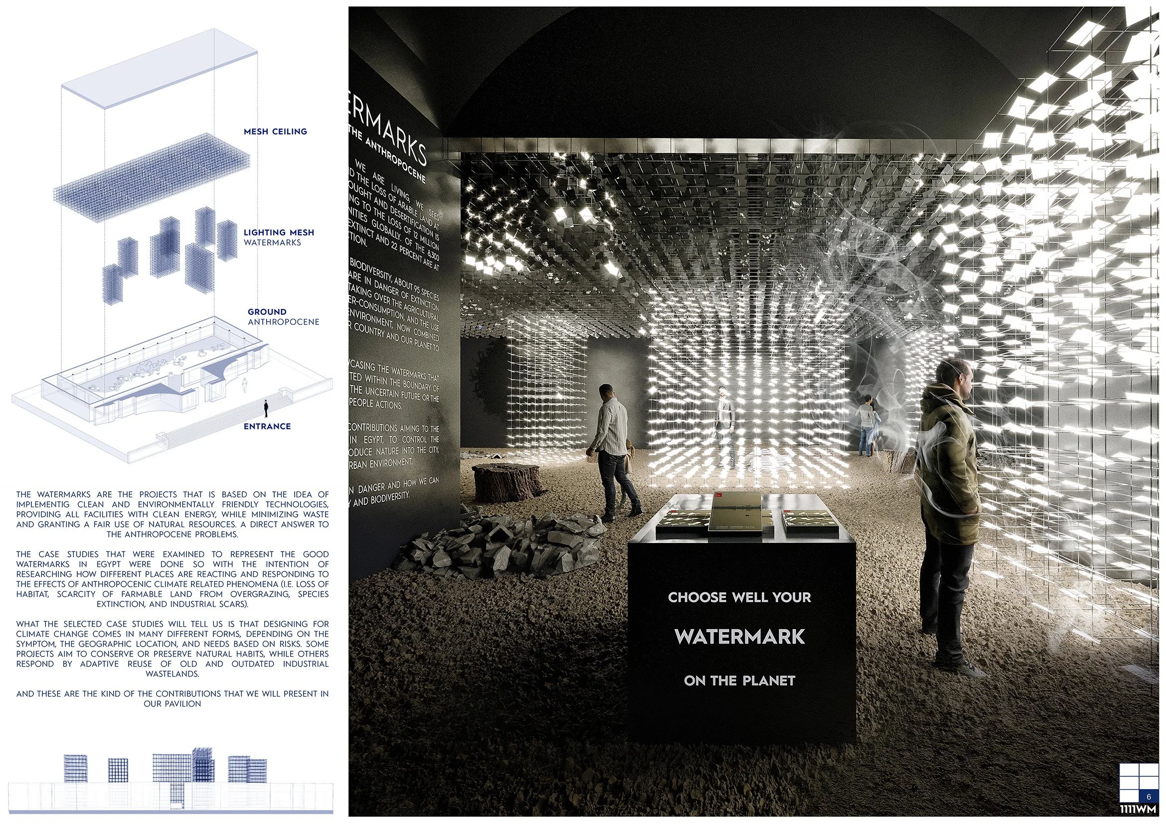In the egyptian pavlion we are showcasing the dangers that is facing our planet and the good watermarks that humanity is putting on earth facing this challenges reflected within the boundary of the egyptian land. Showing signs of the uncertain future or the better future based on people actions.